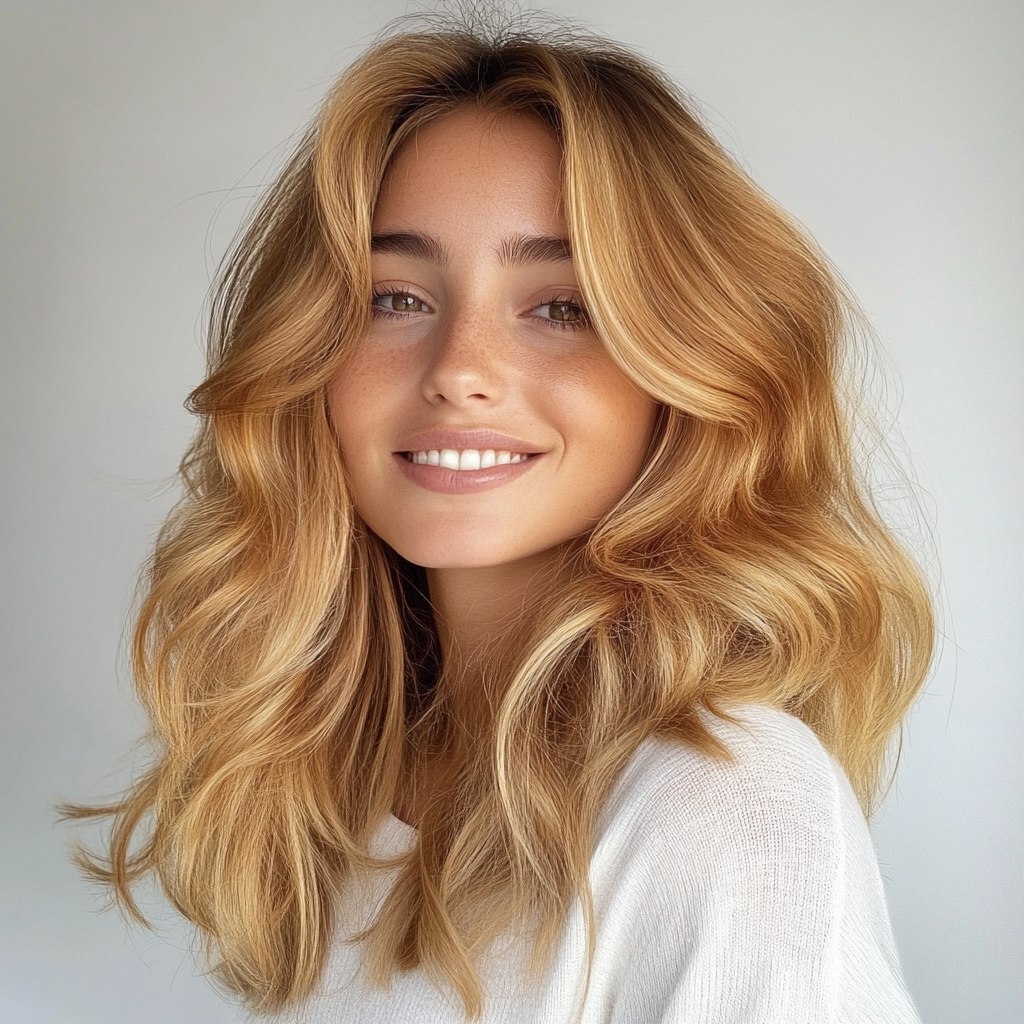 - Тёплый оттенок кожи: если вам идут золотистые украшения, а лицо сияет рядом с кремовыми тонами, карамельный блонд подчеркнёт природную красоту;